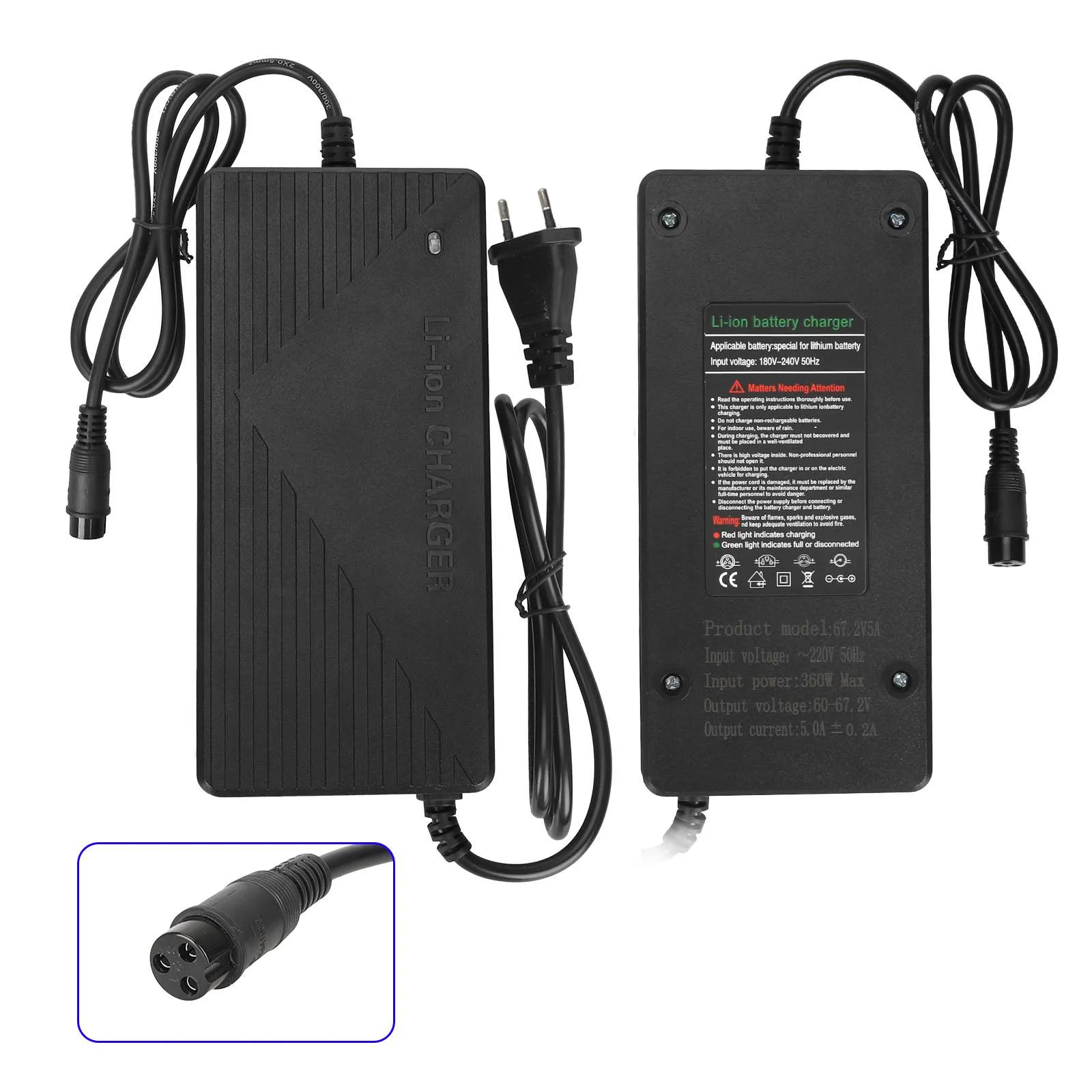 Cargador rápido de 60 V a 67,2 V y 5 A con conector GX16 y enchufe europeo. Cargador de batería de litio de 60 V, 67,2 V y 5 A. Cargador rápido de batería de 5 A. Adaptador de corriente rápido con cabezal de aviación grande para batería de litio.