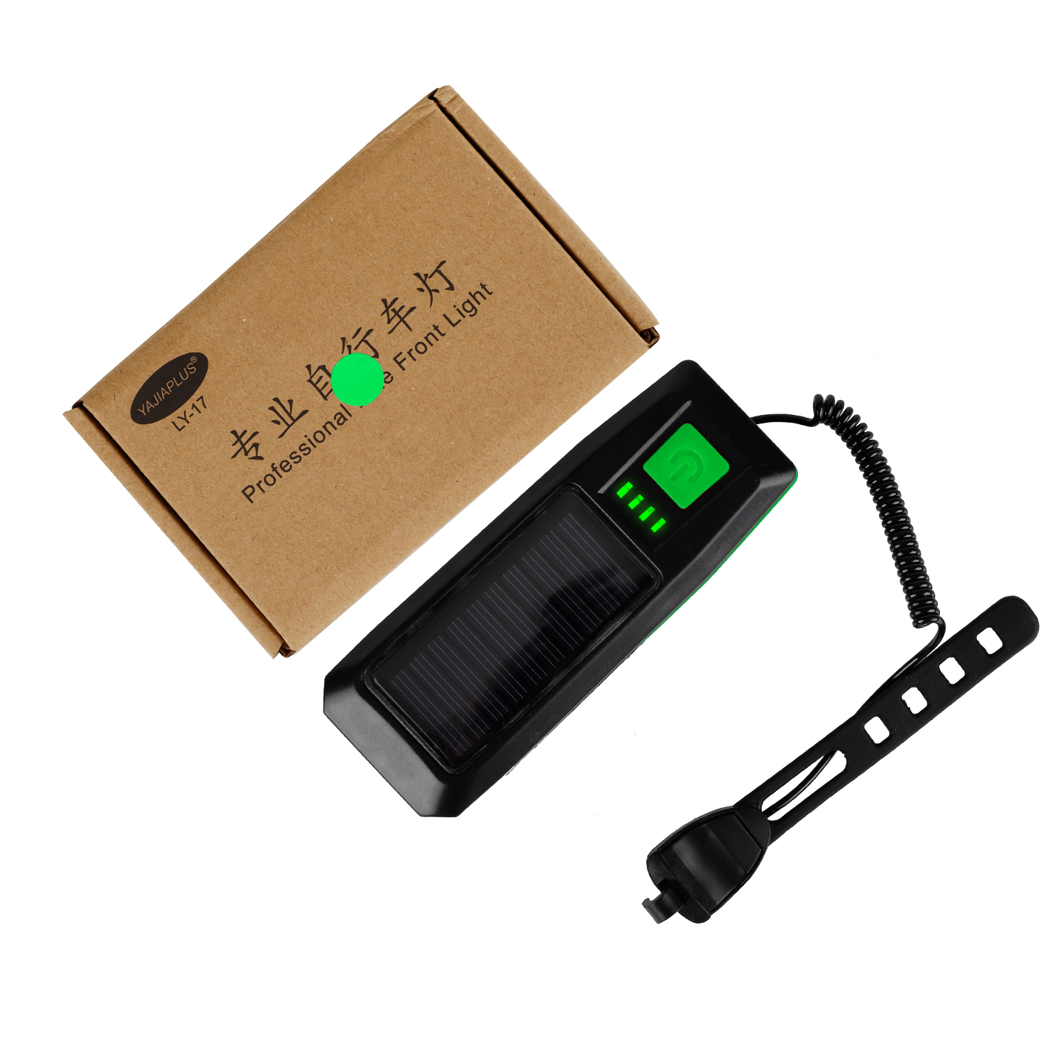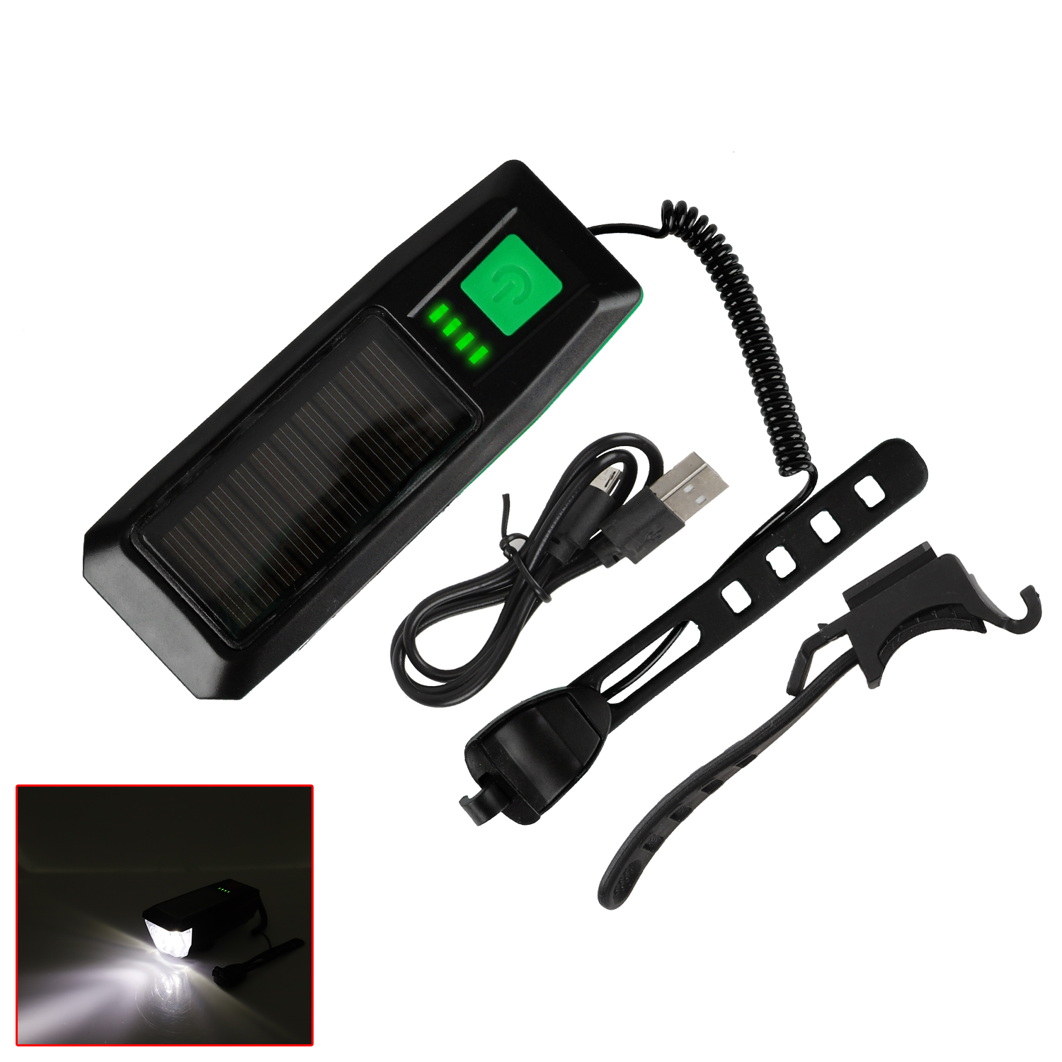 Luz de bocina de carga USB solar verde Luz de bocina de carga USB solar verde para bicicleta Luz de bocina de carga USB Faro de bicicleta de montaña Iluminación nocturna Equipo de ciclismo