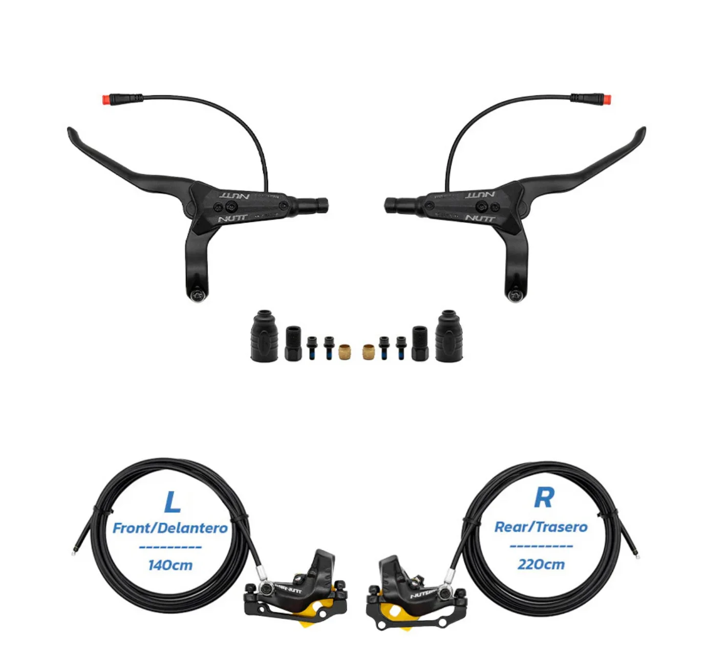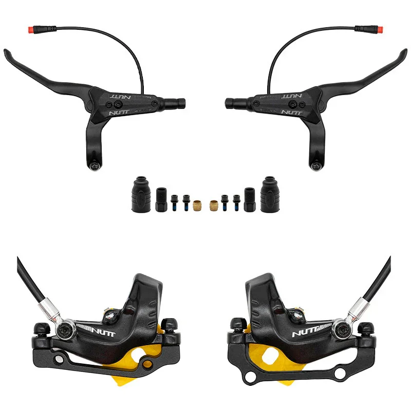 Kit de freno de disco hidráulico de cuatro pistones NUTT Rueda delantera derecha 1400 mm Rueda trasera derecha 2200 mm con soporte de montaje delantero 140/160L Trasero 160/180R y kit de freno Y5 Freno de scooter eléctrico de cuatro pistones NUTT Freno de disco hidráulico Y5