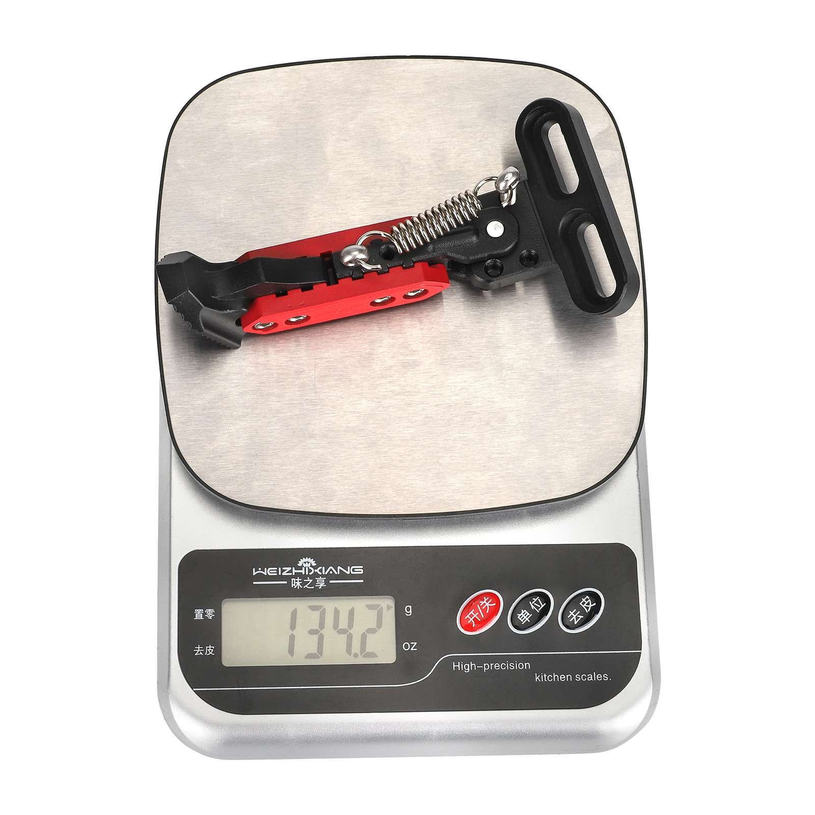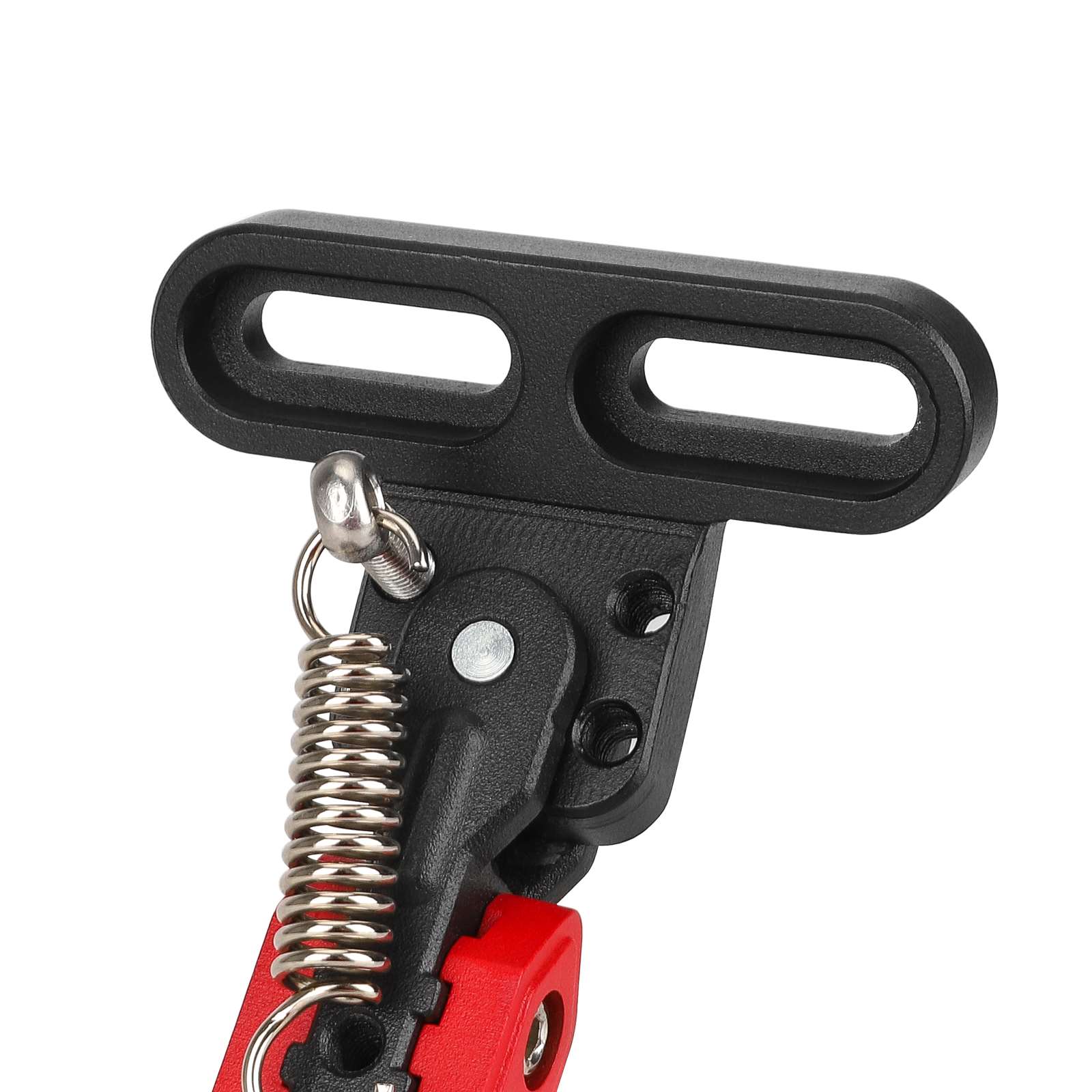 Pata de cabra corta ajustable Ulip negra y roja con orificios de montaje laterales biselados. Soporte de pie de montaje vertical Ulip. Soporte de estacionamiento para patinetes eléctricos. Pata de cabra lateral ajustable.