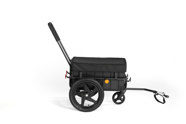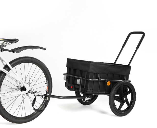 El remolque de carga para bicicletas 2 en 1 es una solución versátil para transportar objetos de forma cómoda y segura. Puede utilizarse tanto como remolque para bicicleta como carro de mano con barra de empuje.