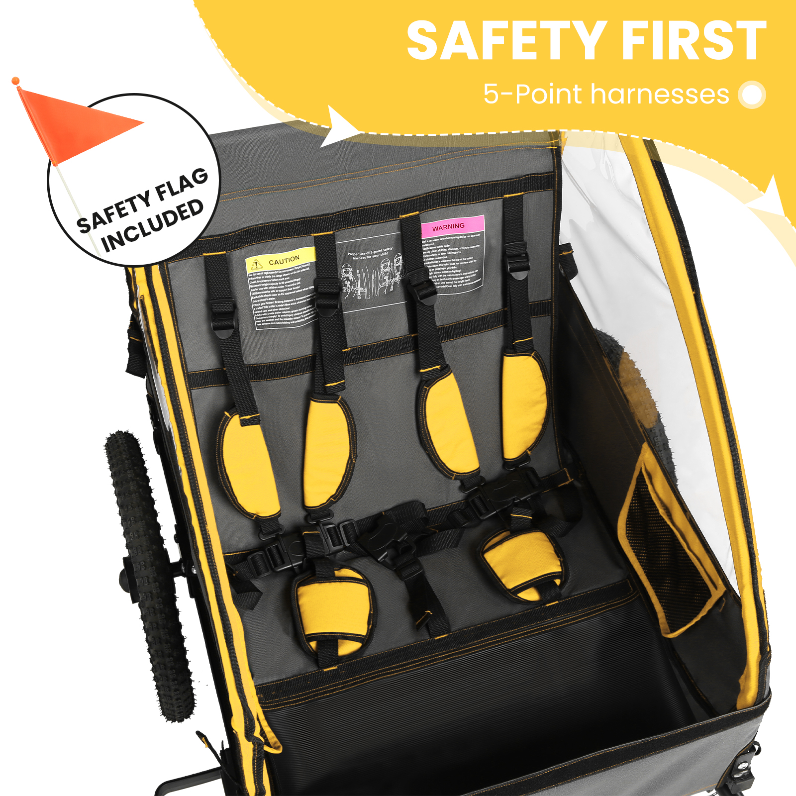 VERSÁTIL Y DIVERTIDO Con el remolque para bicicleta, puedes llevar a tus hijos a emocionantes aventuras y crear recuerdos duraderos. El remolque para bicicleta puede transportar hasta 40 kg y es adecuado para niños de 12 meses en adelante. Disfruta de excursiones escolares, parques y picnics con tus hijos en este remolque. CÓMODO Y RESISTENTE El remolque para bicicleta para niños cuenta con dos sistemas de arnés altos de 5 puntos y asientos ergonómicos para mantener a tu hijo seguro. Una cubierta de plástico en la parte delantera protege contra los elementos, y una cubierta de plástico de color proporciona protección solar. El plan también bloquea los anillos de insectos y proporciona una cierta cantidad de tiempo para una buena belleza y aire limpio. Gran compartimento de almacenamiento: El remolque para bicicleta para niños tiene un gran compartimento en la parte trasera, que ofrece suficiente espacio para juguetes, botellas, bocadillos y todo lo necesario para una salida. Fácil de usar y plegable: Cuando ya no lo necesites, pliégalo de forma compacta y portátil en solo unos pasos, lo que facilita su almacenamiento y transporte.