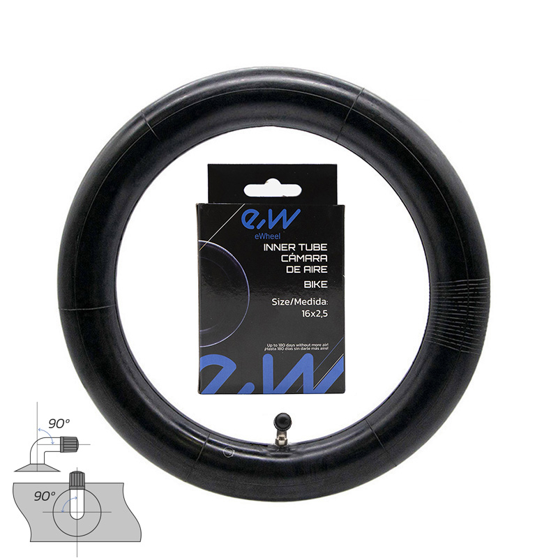 Cámara de aire de dimensiones 16×2,5 con válvula curva a 90ºx90º,diseñada específicamente para su uso en vehículos eléctricos y bicicletas. Ofrece una alta resistencia a la presión y condiciones adversas,asegurando un rendimiento óptimo. Ideal para aplicaciones que requieren una instalación sencilla y un ajuste preciso en llantas compatibles. Su diseño permite una mejor accesibilidad en espacios reducidos para el inflado.