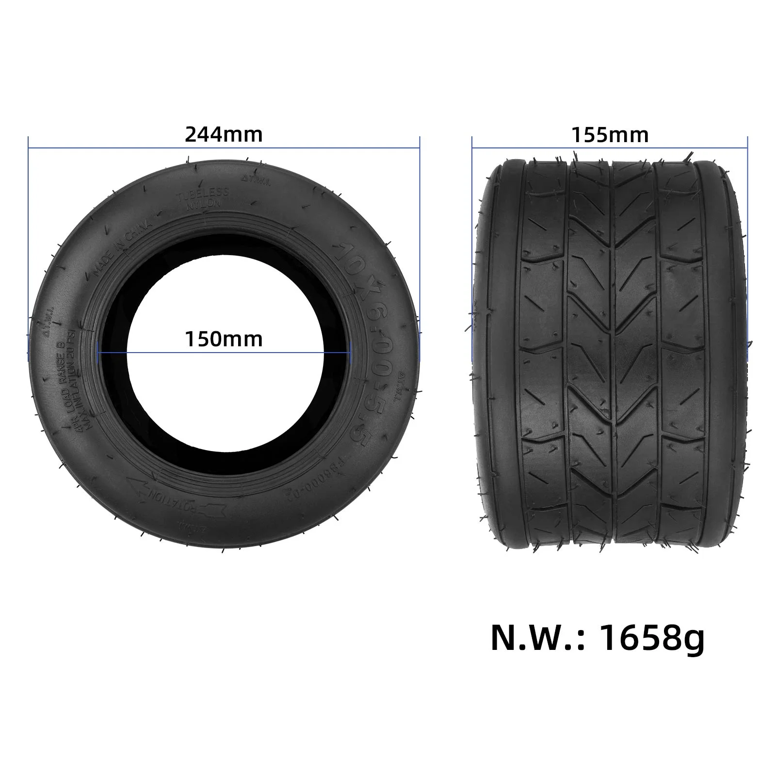 Neumático de vacío de 10 x 6-5,5 pulgadas con diámetro interior de 150 mm, neumático sin cámara de 10 pulgadas, 10 x 6-5,5 pulgadas, para motocicleta, neumático de carretera sin cámara, neumático de goma inflable sin cámara